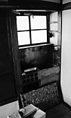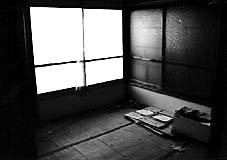 空いてる部屋があるので、ここを例に設備の解説をします。ちなみに、この部屋は角部屋だけど、左の窓の雨戸はレールが腐ってて、落下したまま。窓を開けると、隣のアパートのベランダの正面で、飛び移れる程近い。