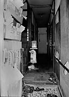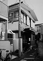 外観(右上の写真) 第一小山荘も他のボロアパートと同じく、細い路地を入った先にある。道は未舗装で、雨の日は、中央に並べられた石が頼りだ。隣の白い「メゾンハピネス」には、若いオネーチャンもいっぱい住んでいるのだが、お呼びでない、状態。