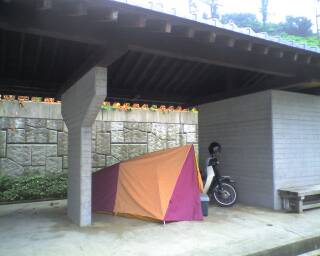 暗闇に紛れて、近くの海水浴場関連屋根の下にテントを張り、原稿を書き、そろそろ寝るとしますか。