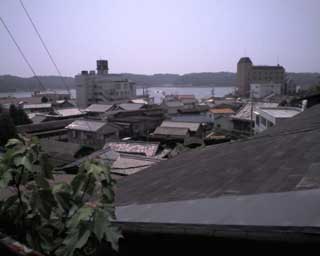 高台から、住宅密集地を撮影。ビルはどちらも大型宿泊施設。対岸は、和部の船着場。