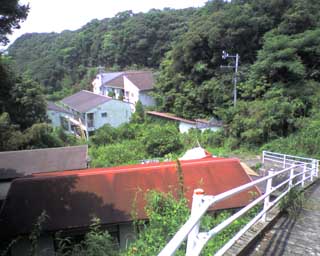 山あいの、怪しげな施設。白い手すりの先にはアーチがあって「わくわくランド」と書かれていた。半ば森にのまれていたけど。