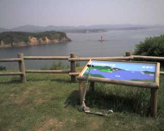 展望代から、的矢湾を望む。余談だが、写っているキックスケーターのタイヤは新品である。2001年8月に、カナダのホワイトホースで2組買った(2ドルくらいで投げ売りされていた)うちの、最後のひと組である。(バックナンバーもよろしくね)私のキックスケーターの総走行距離は、数百キロだろうなぁ。