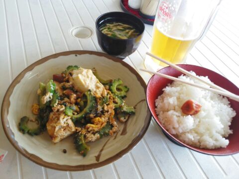 島を一巡りし、ビールとゴーヤーチャンプルーで、ちょと早い昼飯。
