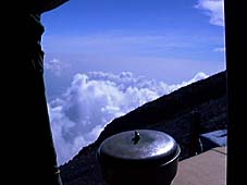 Because the machinery preparation took a long time yesterday, we missed the sunrise. Firstly, we installed a camera compatible to streamworks in the 7th hut named 'Miharukan' on the path to Mt Fuji. However it didn't go well, but before we knew it, time flew so fast, so we left it as it was and jumped on a bulldozer, heading for the peaks.