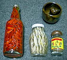さてさて、今月のおみやげプレゼントは、左から、市場で買ったおばちゃん特性とうがらしの泡盛漬け。おばちゃん自身が泡盛の瓶に詰めました。知る人ぞ知る沖縄土産人気アイテム。