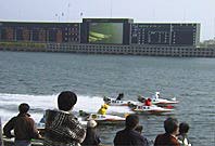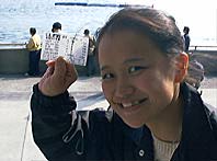 2レースをこなし、徒歩で(5分くらい)常滑駅へ行ったのだが、なんと、バスが全然ない。知多半島一帯どころか、愛知県の東部はバス路線廃止ラッシュで、どうやってもつながらないどころか、バスが走っている地域の方が少ない。昨日買った愛知県の地図には、しっかりとバス路線が記載されているというのに! 検討の結果、常滑ボートを頼ることにする。ボートの無料送迎バスが名古屋市内まで行っているので、それを利用させてもらうのだ。ほんと、今日初日の常滑ボート様様である。それにしても、常滑ボートはすごい。お客さんの電車賃はおろか、有料道路の料金までも申請すると負担してくれるのだ。おそるべし常滑市。で、午後も2レース参加する。写真は、単勝複式一点買いを的中させたKiyomi.F。これで靴が買えるとはしゃいでいた。撮影はAkiraK。