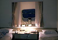 これが、我々のお部屋。進行方向側に窓があるため、行きは部屋でサテライトポータブルホンが使えます。