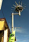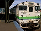 函館へ向かうたった一両の電車。江差駅前には雑貨屋一軒のみ。