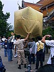 チェンマイを見下ろす山の山頂にあるドイ・ステープ寺院境内にて。これは熱気球。お祭りなので、街のあちこちで上げられる。紙製で、爆竹がぶら下げられていて花々しい。夜は、まるで星空のように多数の気球が上がる
