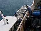 阿嘉島から座間味島へ戻ることにして、12:00の船に乗る。写真は、ざまみ丸から慶留間島行きの船に物資を移している所。ちなみに、慶留間島までは90円也