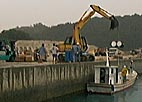 ざまみ丸と違い、フェリーあぐににはクレーンがないので、慶留間島への渡し船には、フォークリフトを使って荷物を詰み込みます。私も乗り込んで、いざ慶留間島へ