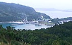 橋で繋がれたおとなりの外地島の展望台から慶留間島の市街地を望む