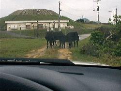 牛に行く手を阻むこともある。左奥は航空機向けの施設とのこと