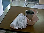 モーニングセット。顔を拭くタオルと歯を磨く水。おそらく今日まで。