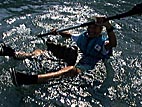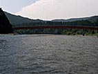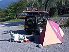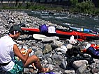 キャンプ場前の河原にて戯れる同行者。水温が27度もあって、超快適。千曲川が24度だったことを考えると、信じられない温かさ。結局14時前にゴールしてしまったのだ。この後、スタート地点へ残してきた車を回収したり、買い物したり、釣をしたり、風呂へ入ったり(近くの宿で借りて200円也)、焼き肉したりで、快適に過ごしたのでありました。就寝は23:30頃かな。ISDN公衆電話がなくてアップロードできなかったけど。