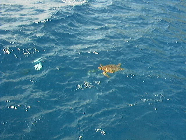昨日に続き、また海亀発見。昨日のよりデカイし、明るいので種類も判別できる。アカウミガメだ。今度はすかさずカメラを準備する。浮上途中をデジカメで撮り、その後フィルムで撮った。残念ながら鼻を上げて息をしている所は目を合わせただけで撮れず終いだった。(「やべ」って顔していそいそ潜って行ったように見えて可愛い)