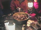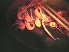 高台へテントを移動し、食事を作る。写真は、スーパーで買ってきた手長エビ。
