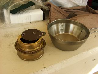 今回、バーナーは軽量化のため、トランギアというアルコールバーナーを使用している。単なるアルコールの容器なので軽い。火力の調節はアバウトだけど。