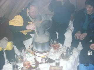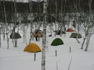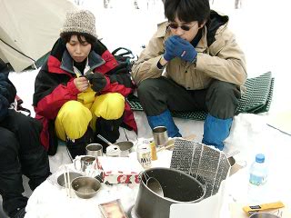今回のメンバーは7人。テントを設営後、昼食を食べる。雪を掘って作ったテーブルと椅子で、メニューは味噌煮込みうどん