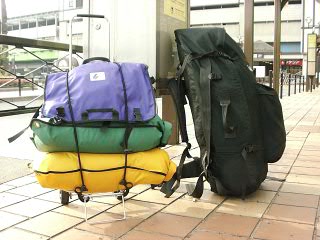 ファルトボート一式を担ぎそれ以外の装備をカート(通称ガラガラ)にくくりつけて引いていく。
