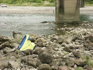 普段の装備なら雨でも河原に張るのだが、今回持ってきたテントに今ひとつ信用が持てず、前室もないことから、せめても、と、あがいてみました。橋まで高さがあるので、実際降ったら意味をなさないかも知れないけど。