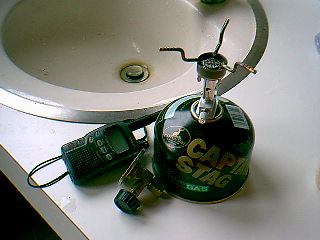 今回の新兵器? 左がラジオ付き無線機、真ん中が詰め換え君、右がマイクロバーナー