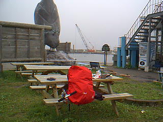 散策は30分程で切りあげ、雨もやんだので、港の木製のベンチとテーブルで、カモメの乱舞を眺めながらビールを飲みつつ原稿を書く。