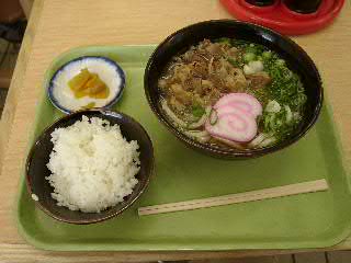 0830に山口県内のPAに30分停車。その隙に朝飯として、肉うどん半ライス付き390円を食べた。