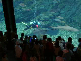 ダイバーのお姉さんが水中ビデオカメラを持って大水槽に潜り、解説してくれる。観ている子供たちからの質問に直接答えてくれるので、なかなか良い企画だと思った。