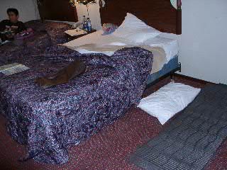 ベッドが2つしかなかったので、私は床にキャンプ用マットレスと寝袋で寝ましたとさ。(予備ベッドを入れてくれるはずが、なかった、とかで入れてくれなかったのだ)