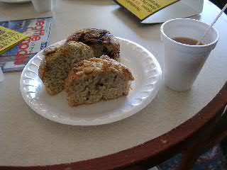 朝食が9時半までという情報を得、あわてて食べに行く。セルフサービスでパンとコーヒー。