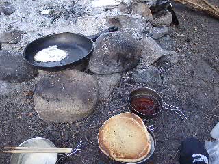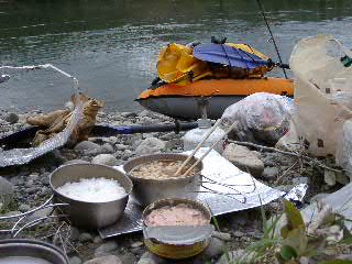 目の前の川で釣りをしたんだけど、釣れなかったので蛋白源は無し。