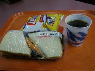 朝食は、カフェでサンドイッチとコーヒー。袋菓子がおまけで付いて、5ドルだった。