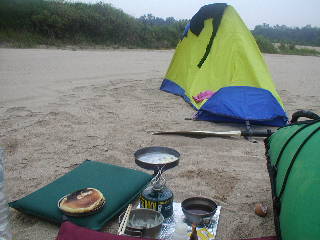 8時間の漕ぎ、日没、45kmの、いずれかを満たすまで漕ぐつもりだったのだが、結局8時間の条件が最初に満たされ、43km、1845で終了。ちなみに、太陽は19時を少しまわったところで山のはに沈んだ。