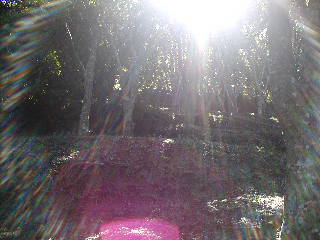 椿園(椿は島の主要作物)の中で、雨のような逆光