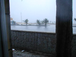 朝食もほぼ終わり、2杯目のコンデンスミルクティーを飲んでいたとき、そいつはやってきた。時折空が轟くことがあったので、もしかしたら、とは思っていたのだが、突風はいきなりやってきて、その数秒後には、視界もままならない大雨になっていた。