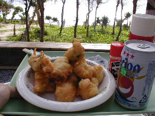 渡口の浜までぐるりと巡って(下地島へは行かず)、渡口の浜のお店でビール&天ぷらのおやつ。