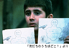 だが決して勘違いしてはならない。この子供的視線は、例えば小津の『生まれてはみたけれど』('32年)の場合のような、大人社会の規範(会社の上下関係等)のこっけいさや醜さを暴露してしまうような批判的限差しとは微妙に違っているからだ。事実ここでの子供たちの視線は、小津の子供たちが彼ら自身の視点に立って大人社会の虚飾を発見していくときの能動性と主体性を全く持っていない。反対に彼らの視線は、眼の前に起きている出来事をただ無防備に受容する他はない、全く「受動的」な視線である。その典型例として『友だちのうちはどこ?』の主人公アハマッド少年の、あの素晴らしい「眼」を思い出して頂きたい。いつも大きく見開かれた彼の眼は、様々な出来事に興味を持って能動的に世界に向けられる好奇心の視線というよりも、見たくない出来事までをも含めて全てが視界に入り込んで来てしまうことに脅えるばかりの恐怖の視線だったと言えよう。つまり彼の「眼」は、いやそしてロッセリーニやトリュフォーやカネフスキーに出てくる子供たちの「眼」もまた、荒々しい現実世界を剥き出しのまま受容する以外に能力を持たない独特のものなのだ。