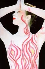 当時、コーセー化粧品の美容部長だった小林照子さんと話をしまして、女性の身体をキャンバスにして絵を描いてみたい。ヒントはタトゥーだが、あれをもっとカラフルなものにしたい。ということで、最初「炎」を描きました。