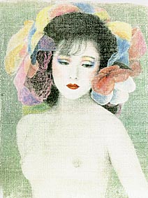 藤:一点目は、モノクロ写真を壁紙のような素材に焼き付け、パステルで彩色したもので、Fグラの初期の作品です。カラーでもモノクロでもない、絵のような写真を作るというのがFグラの最初の発想でした。中でもこれでうまくいっていて、気に入っている作品の一つです。二点目の作品は、コンピュータを使って、越前の海、四季の花、太陽を組み合わせた作品で、屏風に焼いてあります。