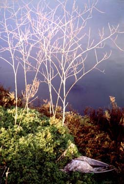 When Arcadia and I walk near the San Francisco Bay, I always bring a camera. This time I had my Kodak Retina IIc. The bird and the shrubbery were arranged exactly as you see them. I simply photographed what was already there. The white twigs look like a great, spindly tree, making the bird appear like some enormous mythical beast.