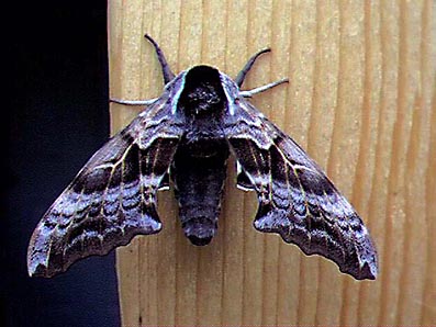 Hawk moth on pine doorframe