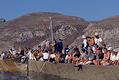 Tourists are bathing the sun and waiting for the catch on glassy sea. They look peaceful by the contrast with the harsh catch.