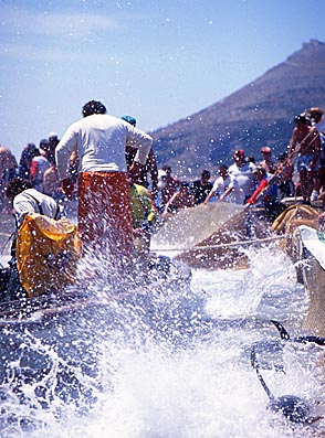 A tuna fish's fin appears with a big splash above the surface of the sea. Sea turns to be white all over. All of the sightseers get soaking wet.