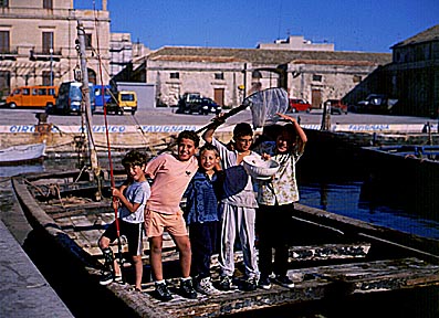 Children playing around in the fishing boat. They might have dreams of becoming fishermen.