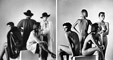 ヘルムート・ニュートンで極め付きの作品は、1981年ヴォーグ・フランス誌に出た、着衣と同じポジション、同じポーズでモデルを全裸で撮影し対比させた写真である。ヘアーを風にそよがせ、堂々と街頭を闊歩する風情の超一流モデルたちの姿は衝撃的だった。晴れの席で取り澄ました女の人達を、頭の中で裸にして一人顔を真っ赤にした少年の頃が思い当たる。大人の眼になって見ても、生々しい肉体と衣裳の皮肉をここまで突きつけられ、ドキッとしない男はいないだろう。