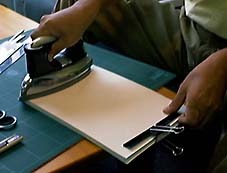 中表紙の背にホットメルトを張る。ホットメルトは東急ハンズなどで売っている。IPMJに問い合わせても都合付けてくれるらしい。熱で溶ける樹脂製のテープだ