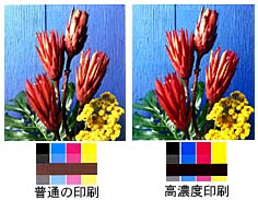 高濃度印刷と高精細印刷という二つの技術を使って刷り上げました。高濃度印刷は通常の印刷よりインキの量を20%から30%増やして、色に深みを与える技術です。実際に見比べていただければ(右図参照)特に赤と青でこれだけインキの量が違うのが分かると思います。