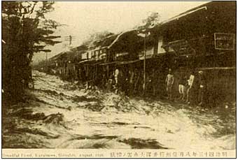 事件絵葉がきのなかに、水害絵はがきがある。明治43年は多分、今年のように台風が多く、やたらと東京周辺で水害が起きた。これが「テキ屋」のような集団の結構な際物になったのだろう。