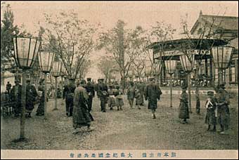 写真/下は熊本市で開かれた御大典記念の国産共振会の記念絵はがきで大正2年、大正天皇の即位大典を記念して各地で開かれた博覧会的行事の一つであった。このような地方都市の行事に対しても絵はがき業者は商売の手を伸ばしていった。